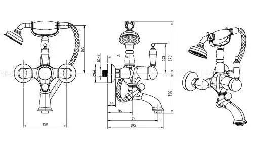 Boheme Tradizionale Nero Смеситель для ванны с душевым набором, излив 19,5 см, цвет: gold 253
