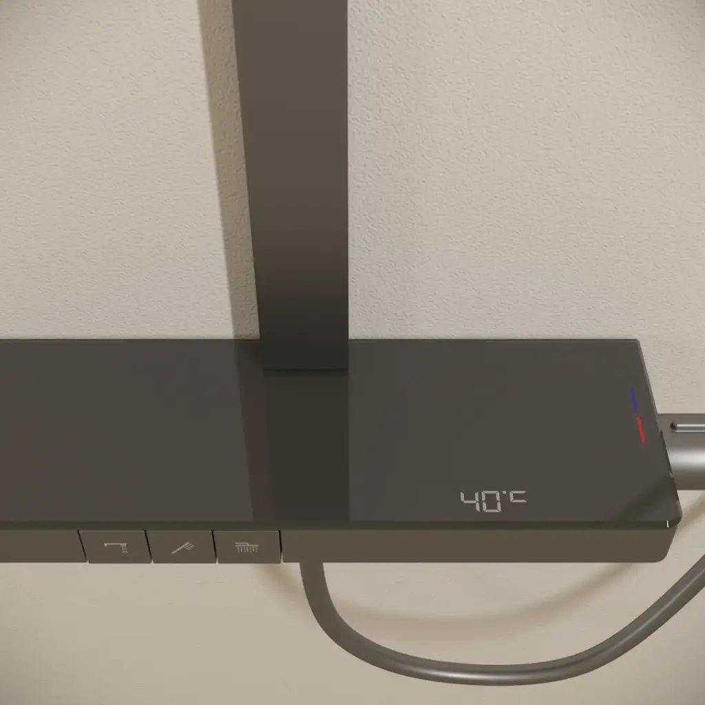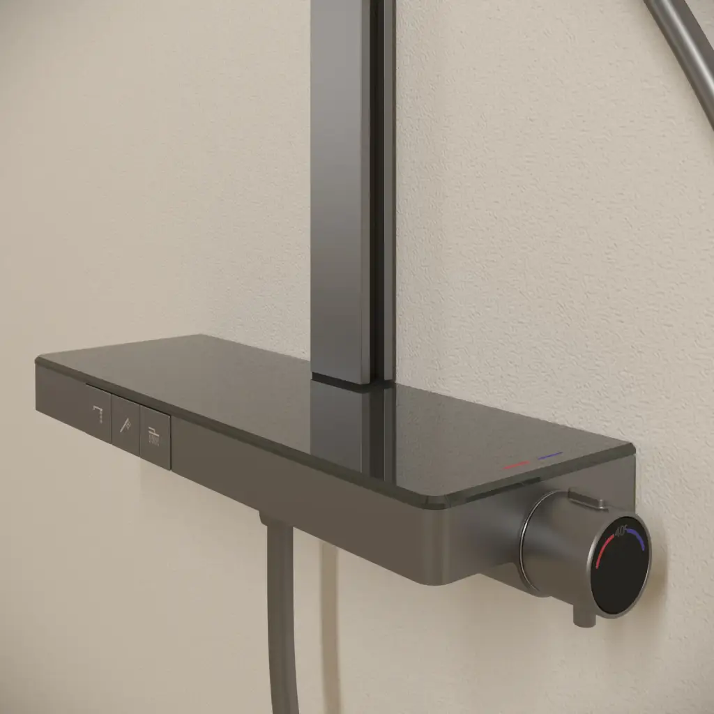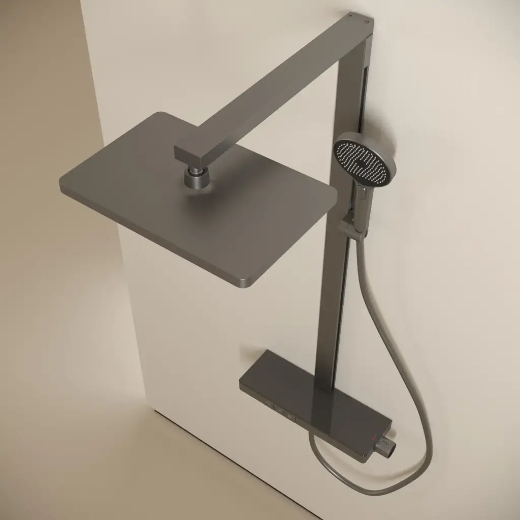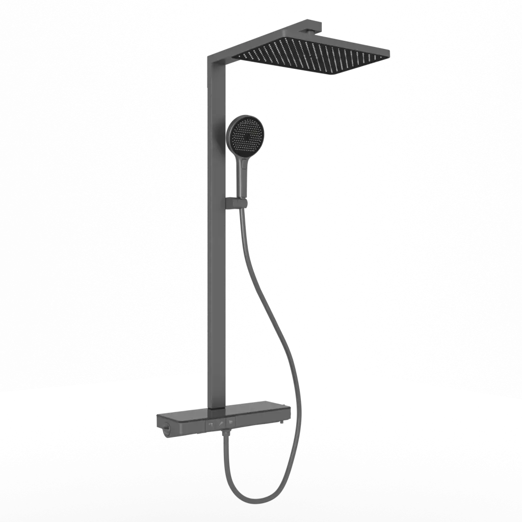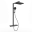 Душевая стойка SANCOS Ваш (Vos) с термостатическим смесителем, изливом, полкой, шлангом 1,5 м, верхним и ручным душем, цвет вороненая сталь, арт. SC6100GG