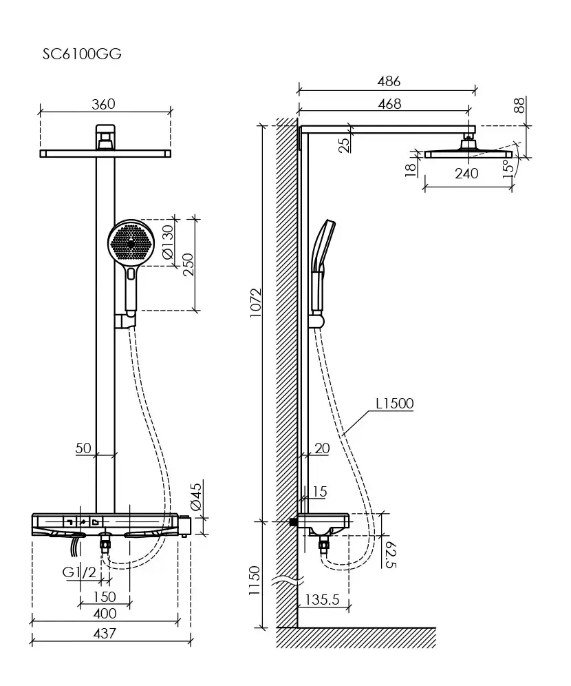 Душевая стойка SANCOS Ваш (Vos) с термостатическим смесителем, изливом, полкой, шлангом 1,5 м, верхним и ручным душем, цвет хром, арт. SC6100CH