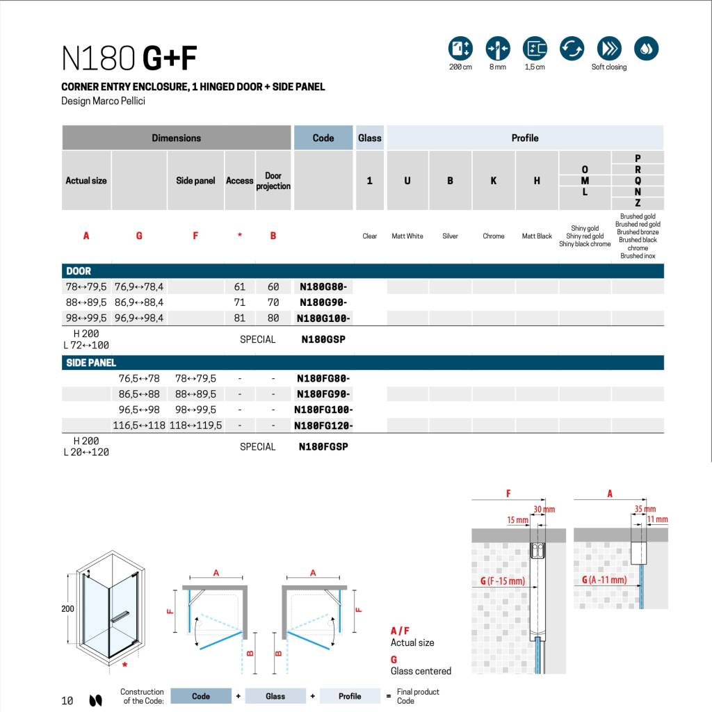 Боковая стенка 100 см (98-99,5x200) Novellini N180 N180FG100-1P, профиль Brushed Gold, стекло прозрачное CrystalClear