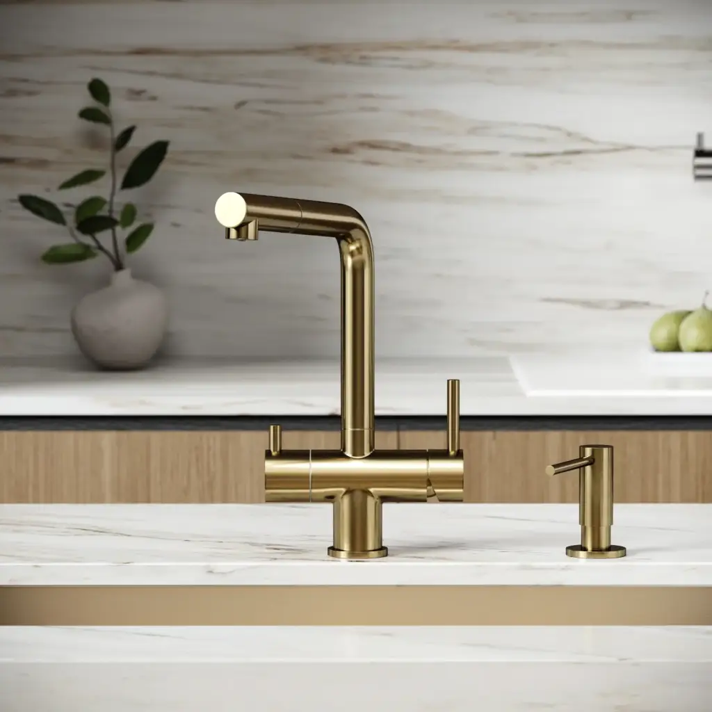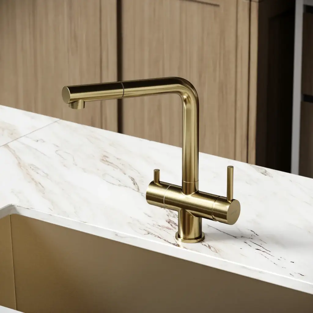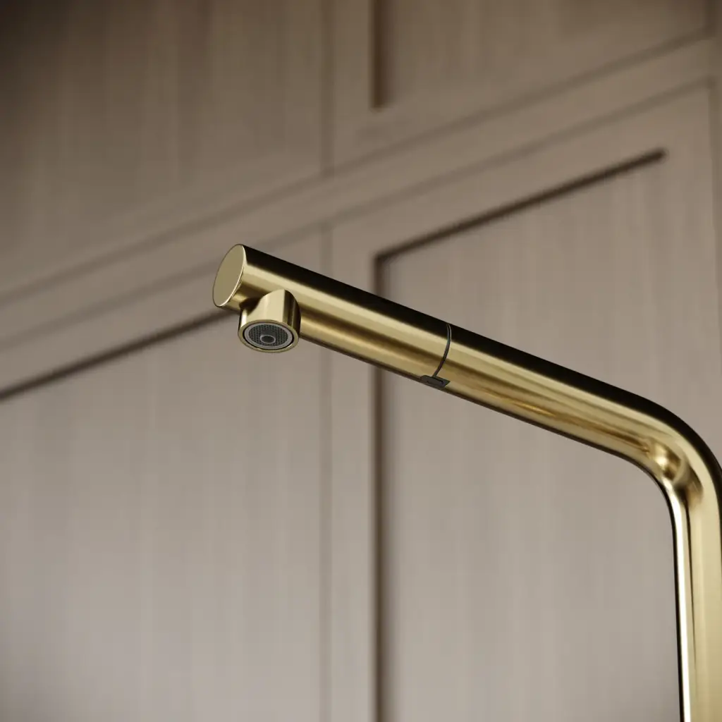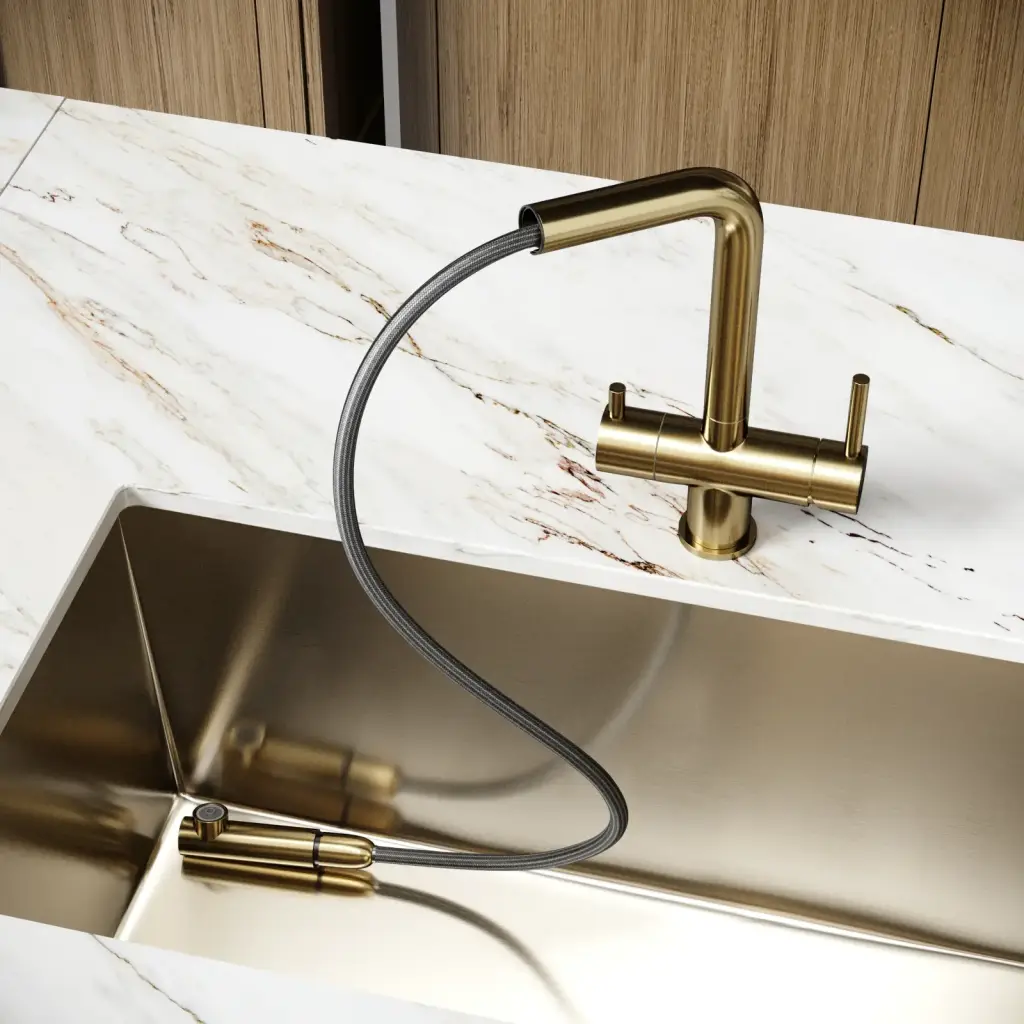 Смеситель для кухни SANCOS Спин (Spin) с поворотным и вытяжным изливом, c краном для фильтрованной воды, цвет брашированное золото, арт. SC4015BG