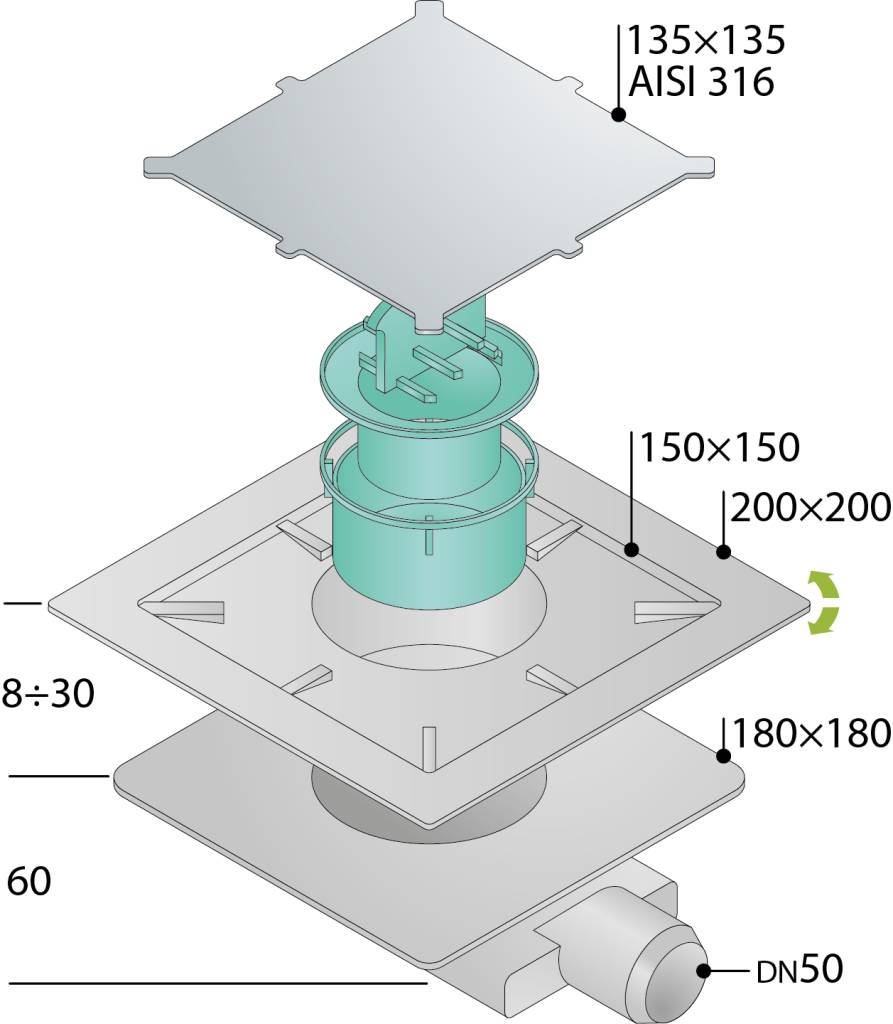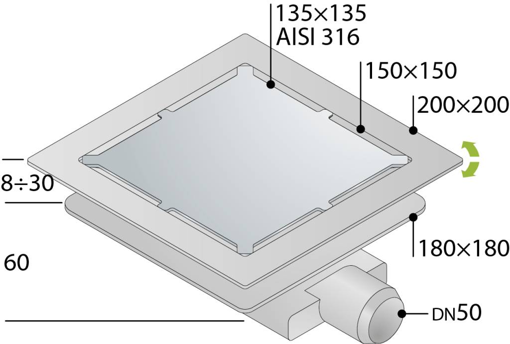 Трап 135х135 мм, решетка под плитку, горизонтальный выход OMP Tea Tirana Unseen 2665.698.8