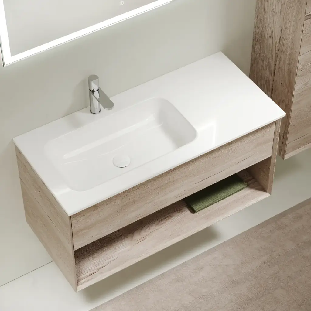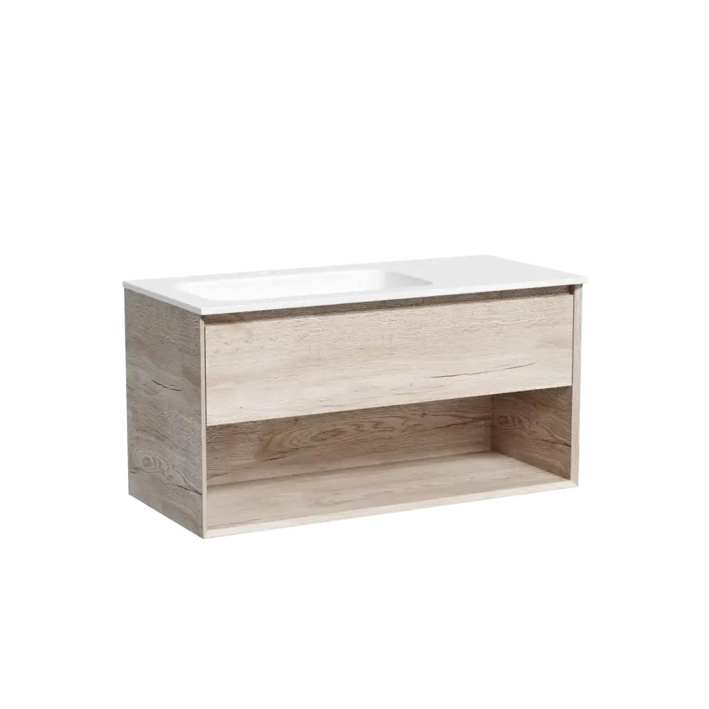 Тумба подвесная SANCOS Marmi 1.0 левая, 995х445х520, c одним ящиком оснащенным доводчиками скрытого монтажа и открытой нишей, дуб галифакс натуральный, арт. MR1.0100LEG
