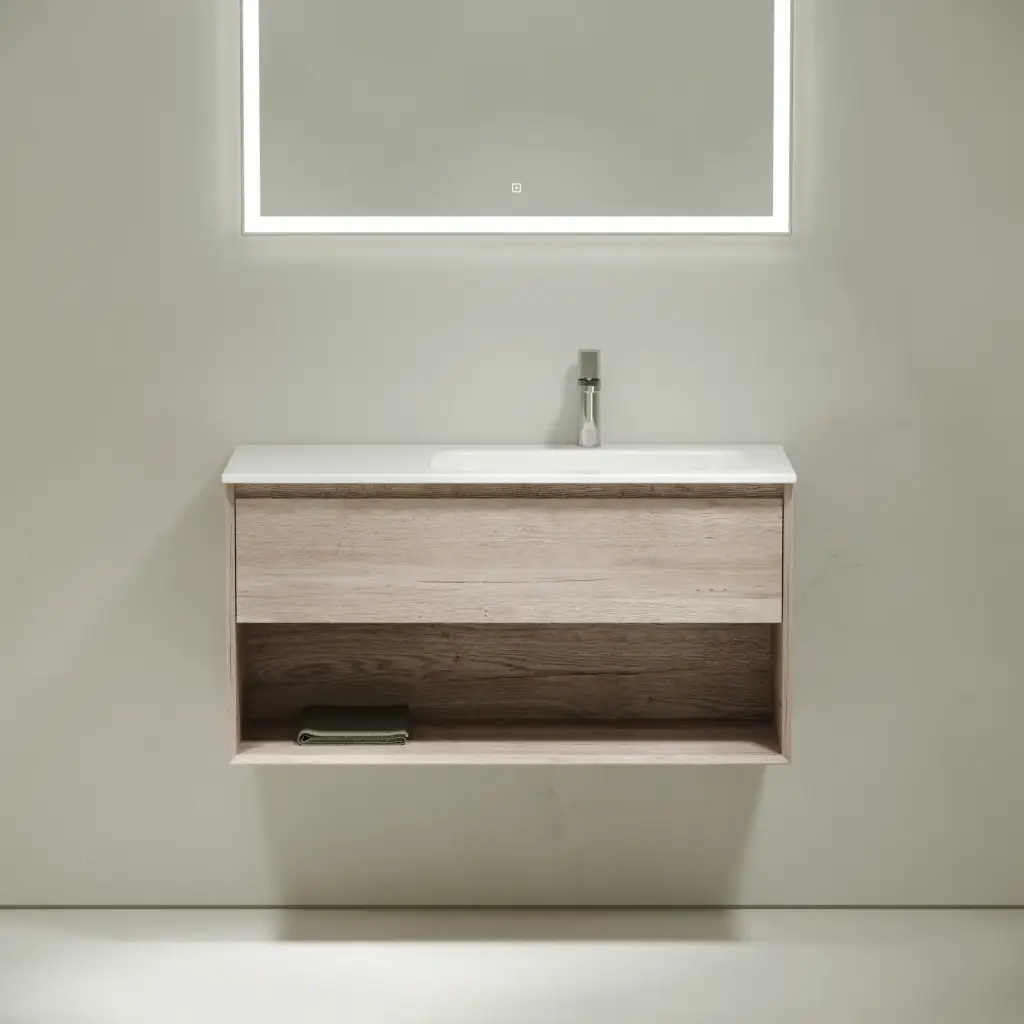 Тумба подвесная SANCOS Marmi 1.0 890х445х520 c одним ящиком оснащенным доводчиками скрытого монтажа и открытой нишей, дуб галифакс натуральный, арт. MR1.090EG