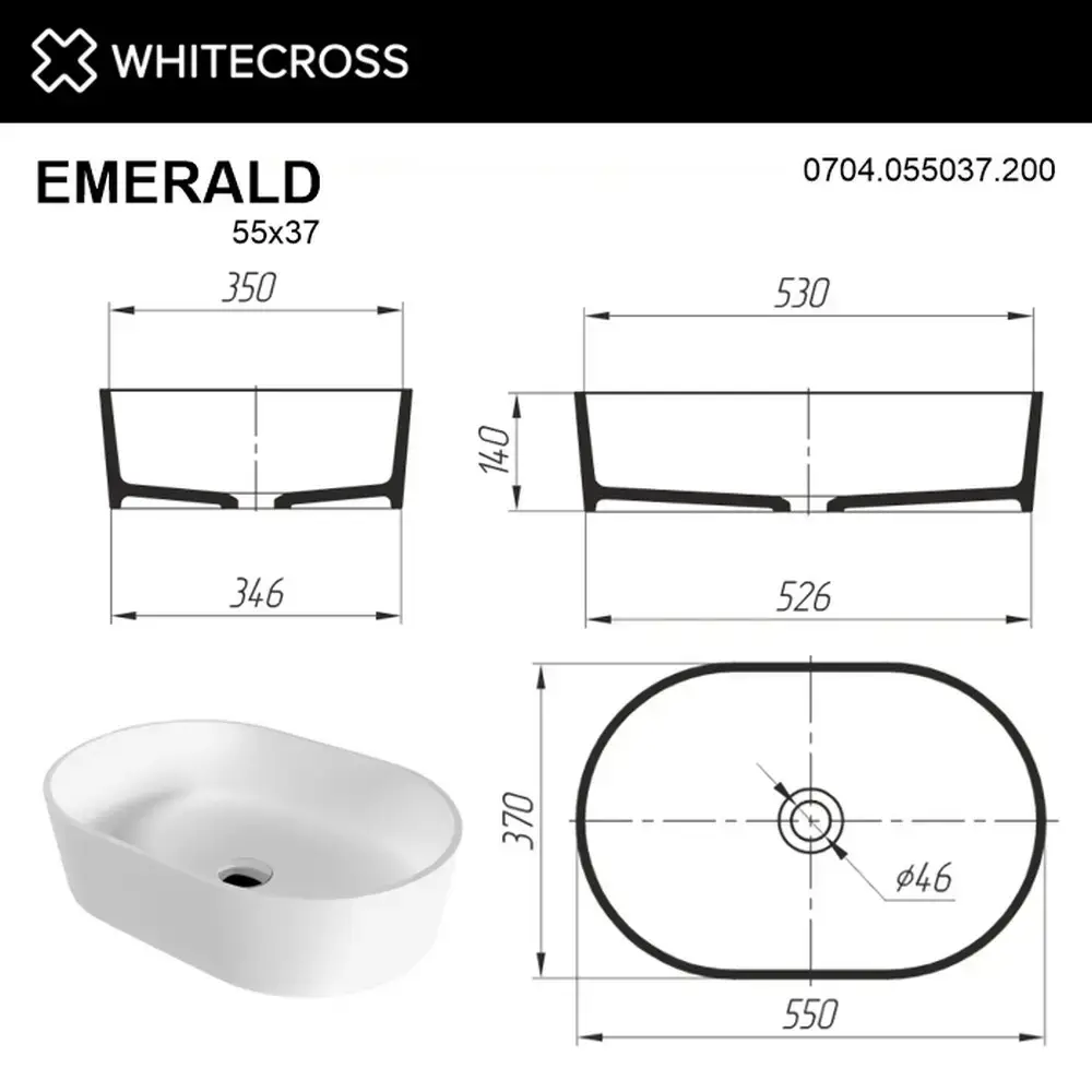 Умывальник WHITECROSS Emerald 55x37 (белый мат) иск. камень
