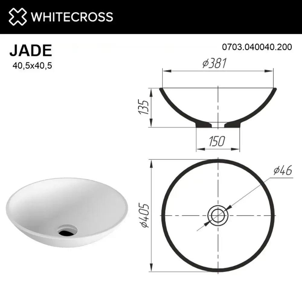 Умывальник WHITECROSS Jade D=40,5 (RAL мат) иск. камень;Умывальник WHITECROSS Jade D=40,5 (белый мат) иск. камень